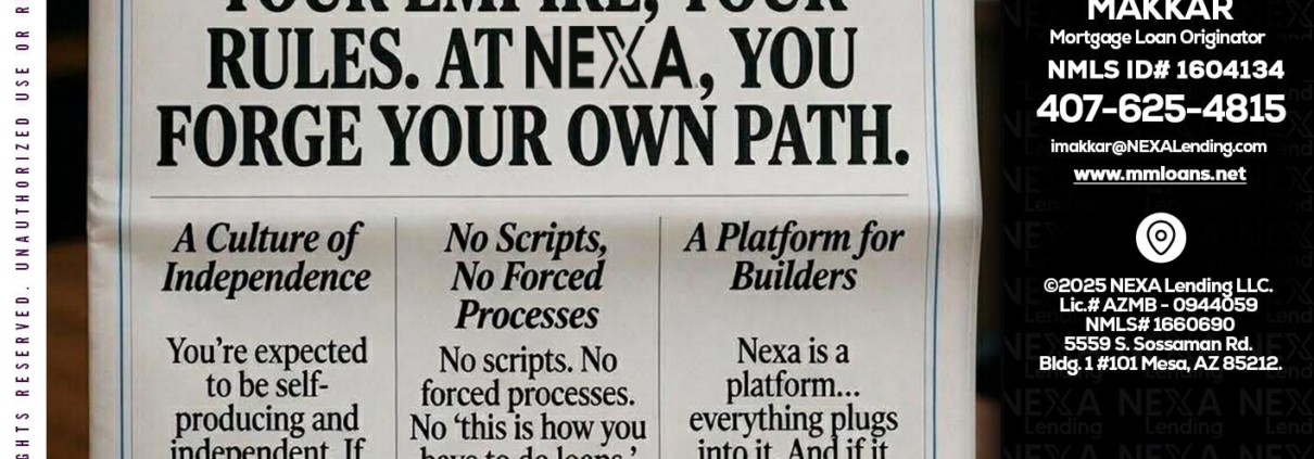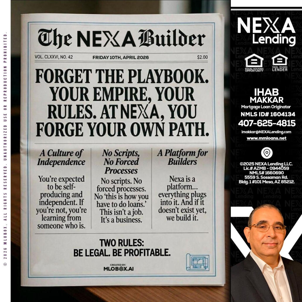 THE NEXA BUILDER - Ihab Makkar -Mortgage Loan OriginatorHi, my name is Ihab Makkar. I’m a Loan Officer with NEXA Lending LLC., offering personalized mortgage solutions, fast customized quotes, great rates and service with integrity.